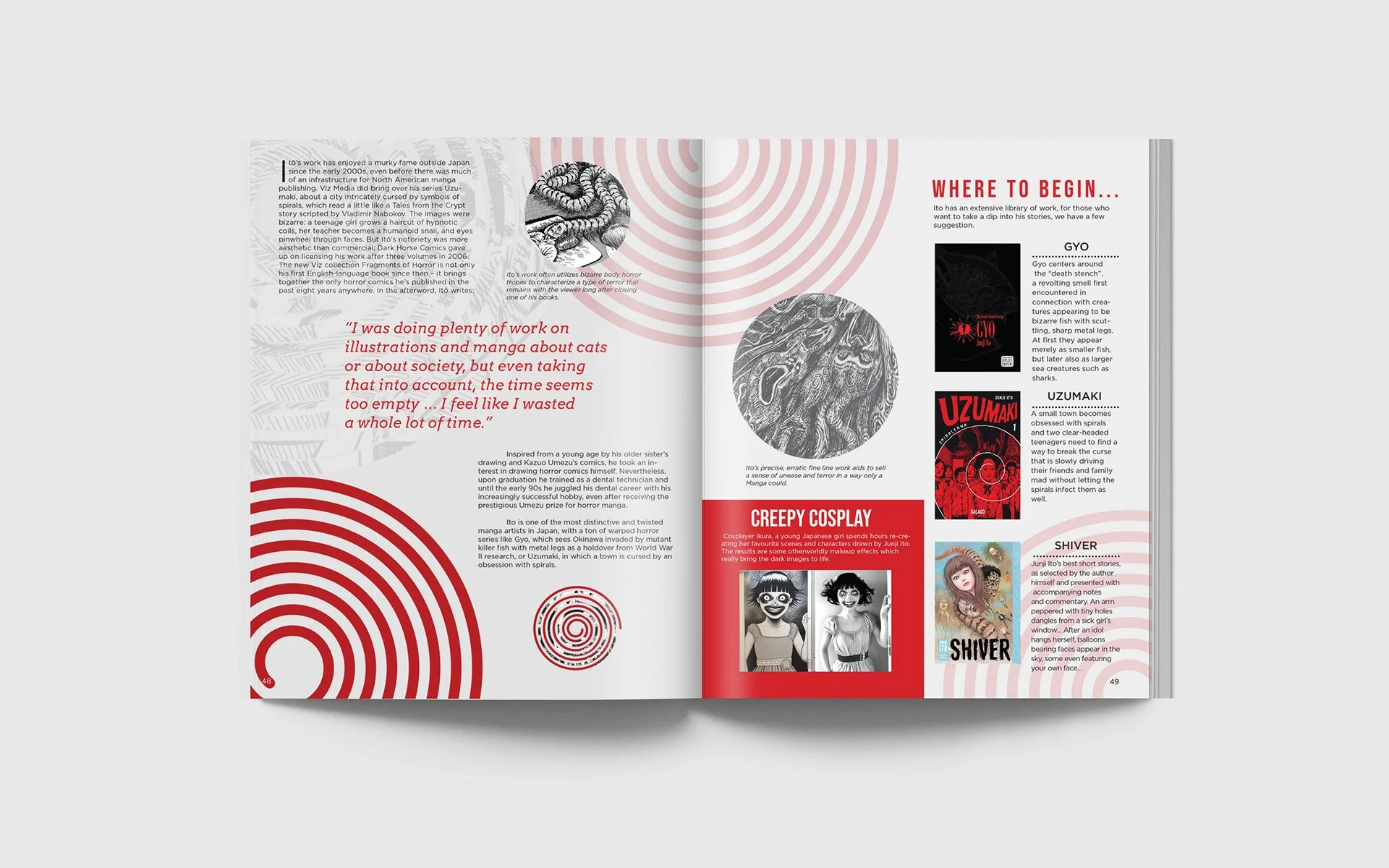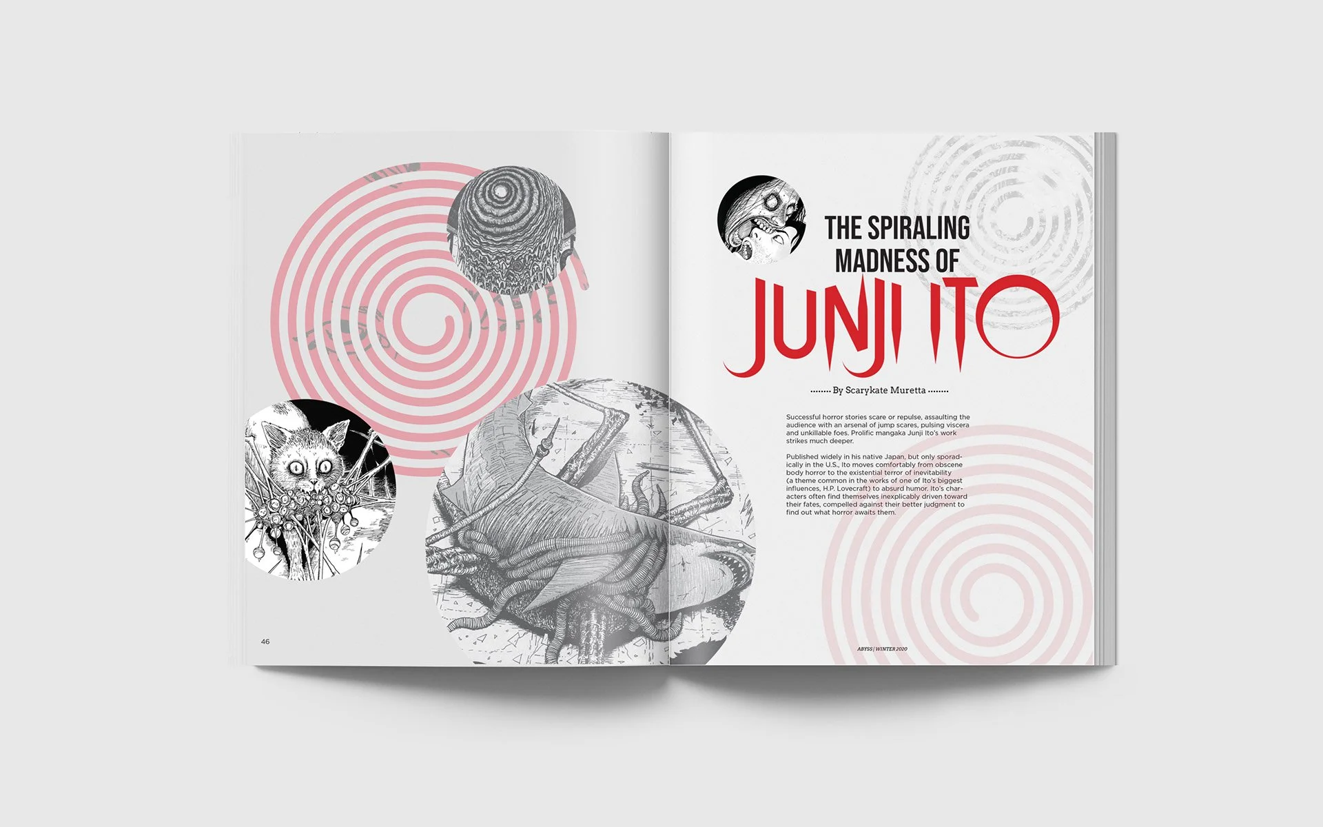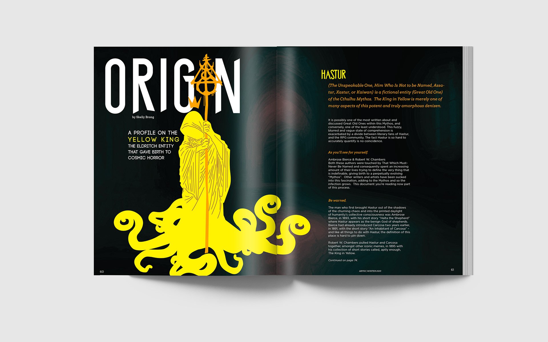 ABYSS is a concept for a magazine related to cosmic horror, a subgenre of horror that focuses on the fear of the unknownmysteries of the universe. An element that appears throughout many of my personal pieces is exploring the misunderstood, which is the core of cosmic horror, albeit with much more sinister undertones.