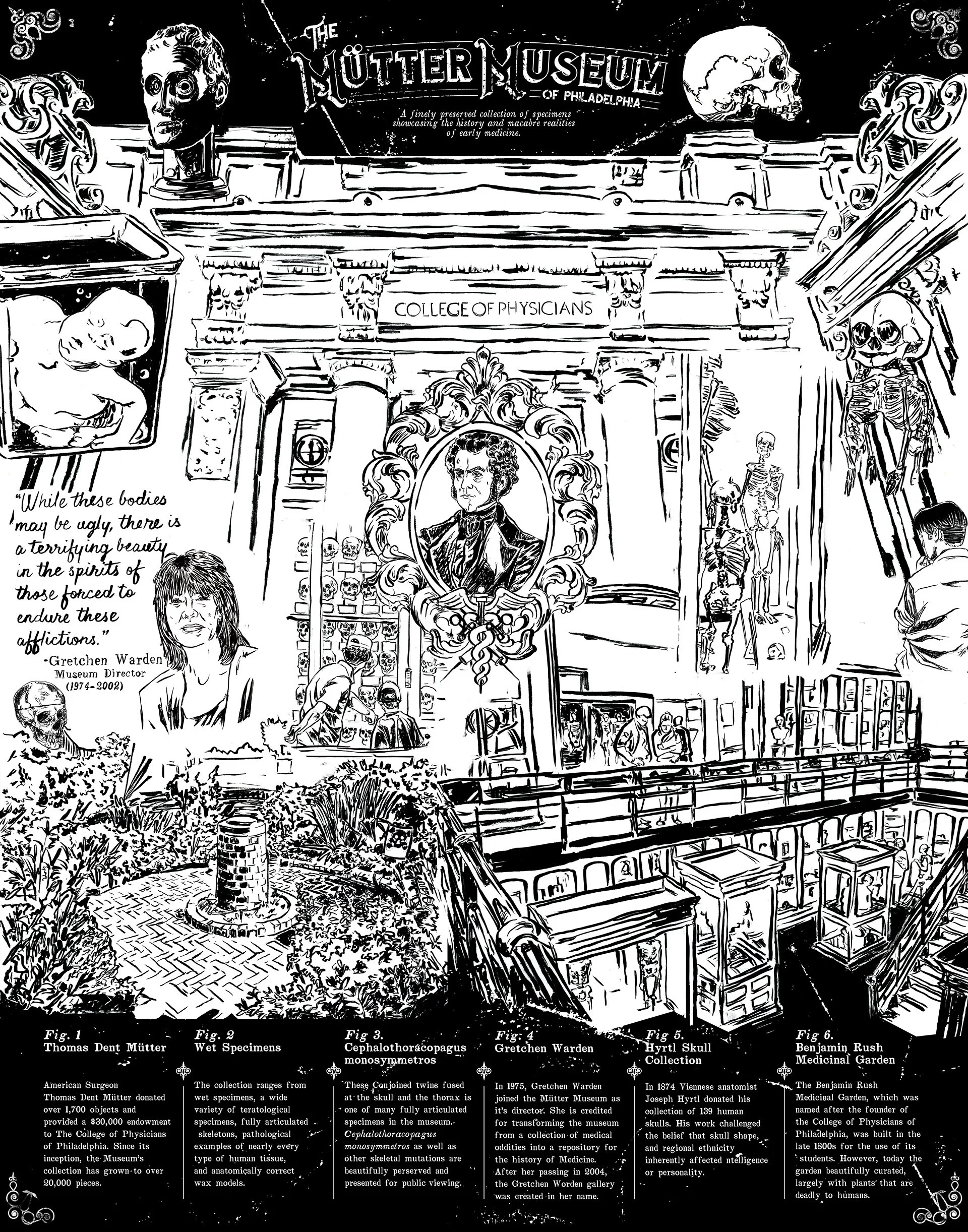 An illustrated profile on the Mütter Museum, a medical history museum in Philadelphia responsible for an artful collection of bizarre, eerie, and educational medical specimens on public display.